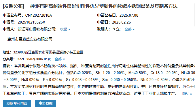 2025年7月8日,浙江青山鋼鐵有限公司聯(lián)合惠州市君豪盛實(shí)業(yè)有限公司成功申請一項(xiàng)名為“一種兼有超高耐蝕性良好切削性優(yōu)異塑韌性的軟磁不銹鋼盤條及其制備方法”專利,申請公布號為CN120272818A,申請日期為2025年2月26日。